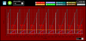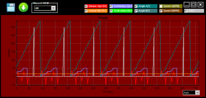Oscilloscopic record is used in order to graphically visualise measured and calculated data. This helps to quickly evaluate the proper and accurate function of ignition unit MASTER. It can thus evaluate the correctness of voltage sensing, counting teeth of mathematic model of the real rotation and angels of closing of output coils.