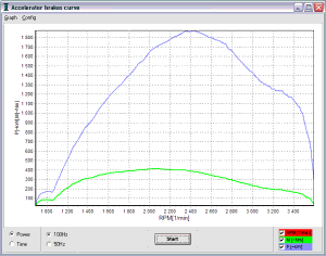 Mezi nové funkce Online vizualizace patří Akcelerační brzda, která provádí rychlý 5s záznam otáček motoru s následným výpočtem derivace (zrychlení) otáček, která úměrně odpovídá kroutícímu momentu motoru.