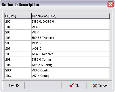 K vytvoření popisu identifikátorů slouží okno Define ID Description. Popis identifikátorů se provádí do jednotlivých řádků tabulky. Potvrzení jednotlivých zadání popisů se provádí stiskem tlačítka Next ID. Pořadí zadávání identifikátorů může být libovolné, po potvrzení zadání tlačítkem Ok dojde k jejich vzestupnému setřídění.