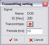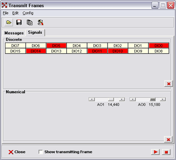 Záložka Signals umožňuje vysílání signálů zadaných prostřednictvím okna Signals database configuration. Data periodicky nebo jenorázově vysílaných zpráv jsou získána sestavením z aktuálních hodnot signálu se schodným ID. Vysílaná data jsou zobrazena v záložce Messages. Změna stavu signálu se provádí pouhým klikem (Discrete) nebo změnou pozice posuvníku (Numerical). Změna periody vysílání se provádí v okně Transtmitting setting, které se vyvolá pro daný signál dvojklikem se současným stiskem klávesy CTRL.