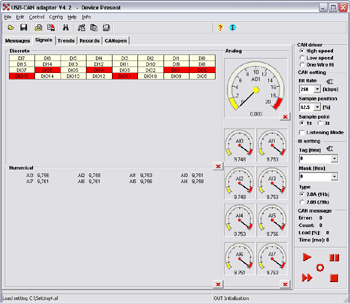 Umožňuje přepočet a zobrazení CAN dat ve formátu skutečných veličin přenášených na CAN lince. Konfiguraci veličin je nutné předem provést prostřednictvím okna Signals database configuration nebo přímo při volbě veličin ke zobrazení. V záložce Signals je možné zobrazit 144 diskrétních veličin 64 numerických nebo textových veličin a 9 numerických veličin ve formě budíku.