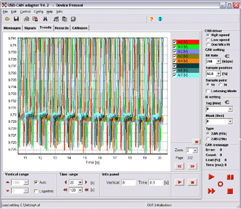Aplikace USB-CAN Adapter byla navržena s ohledem na snadnost obsluhy a přitom nabízí široké možnosti pro zobrazení, přepočet a uložení dat získaných z CAN sběrnice. Hlavní okno aplikace obsahuje v pravé části množství prvků pro nastavení požadovaných parametrů CAN linky. Tento prostor je označen jako Řídící panel CAN linky. Hlavní okno obsahuje záložky označené Messages, Signals, Trends a Records, z nichž každá nabízí odlišnou formu zpracování dat z CAN sběrnice. Mimo záložku Messages vyžaduje každá záložka zadání databáze veličin prostřednictvím okna Signals database configuration.